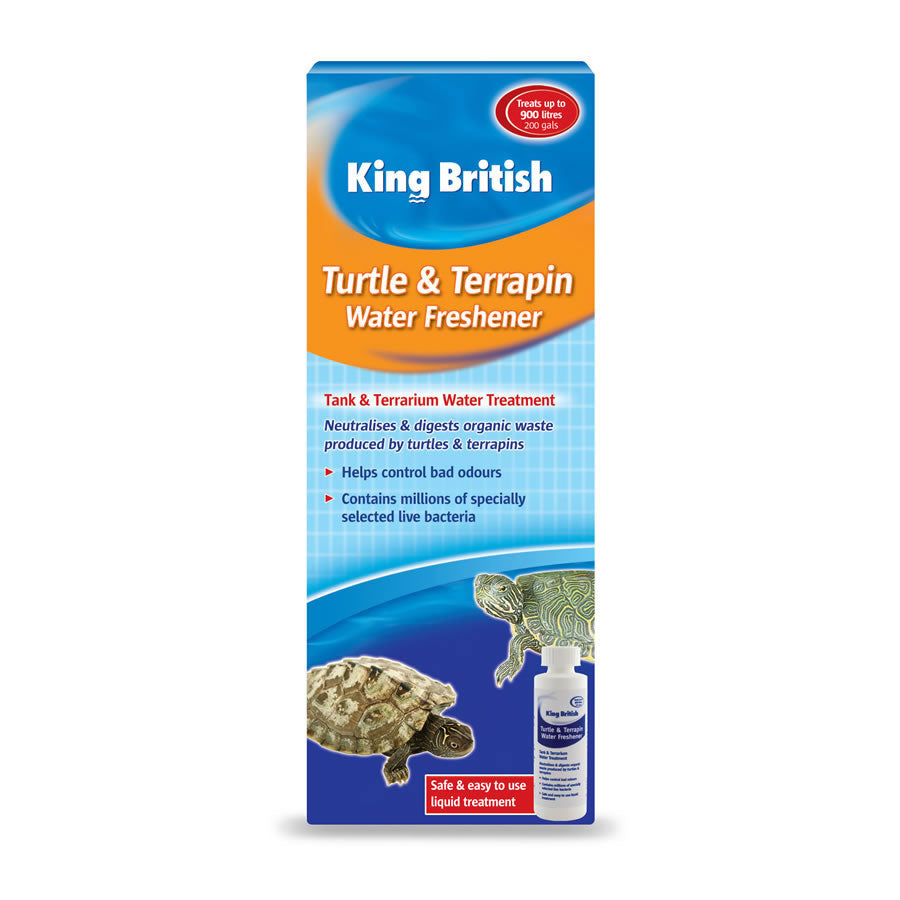 King British Turtle & Terrapin Water Freshener neutralises organic waste and keeps tanks fresh. Turtle & Terrapin Water Freshener contains four natural types of bacteria which neutralise & digest waste produced by turtles & terrapins. If left untreated the pollution caused by toilet waste in the water could lead to ammonia poisoning causing the turtles & terrapins stress & even death. Rapidly eliminates the bad odours that can build up when turtles & terrapins are kept in tanks & terrariums. For use in Turtle & Terrapin Tanks Only. When? To Use Turtle & Terrapin Water Freshener - When setting up a new tank or terrarium or as a twice weekly treatment to keep tanks fresh.