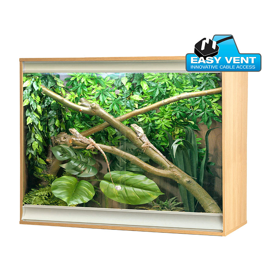 115 x 61 x 91.5 (Height including cabinet 156cm) Large-Deep Oak Arboreal Vivarium: Dimensions 1150 x 610 x 915mm (LxWxH) Height incl Cabinet is 1560mm. Brand New redesigned range of vivaria for arboreal species. Improvements over the Viva range include new deeper bottom rail incorporating integral ventilation system clever cable management system allowing easy installation of equipment with fitted plugs improved door stoppers and complete edging that extends around all sides of the vivarium. Available in three colours (Oak Walnut & Beech) and three sizes (Small Medium and Large-Deep). Matching Cabinet product code TVV131 also available.