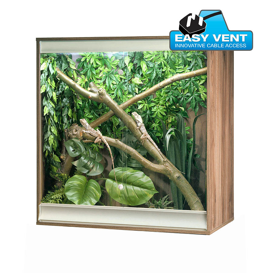 86.2 x 49 x 91.5 cm (Height including cabinet 156cm) Medium Walnut Arboreal Vivarium: Dimensions 862.5 x 490 x 915mm (LxWxH) Height incl Cabinet is 1560mm. Brand New redesigned range of vivaria for arboreal species. Improvements over the Viva range include new deeper bottom rail incorporating integral ventilation system clever cable management system allowing easy installation of equipment with fitted plugs improved door stoppers and complete edging that extends around all sides of the vivarium. Available in three colours (Oak Walnut & Beech) and three sizes (Small Medium and Large-Deep). Matching Cabinet product code TVV112 also available.